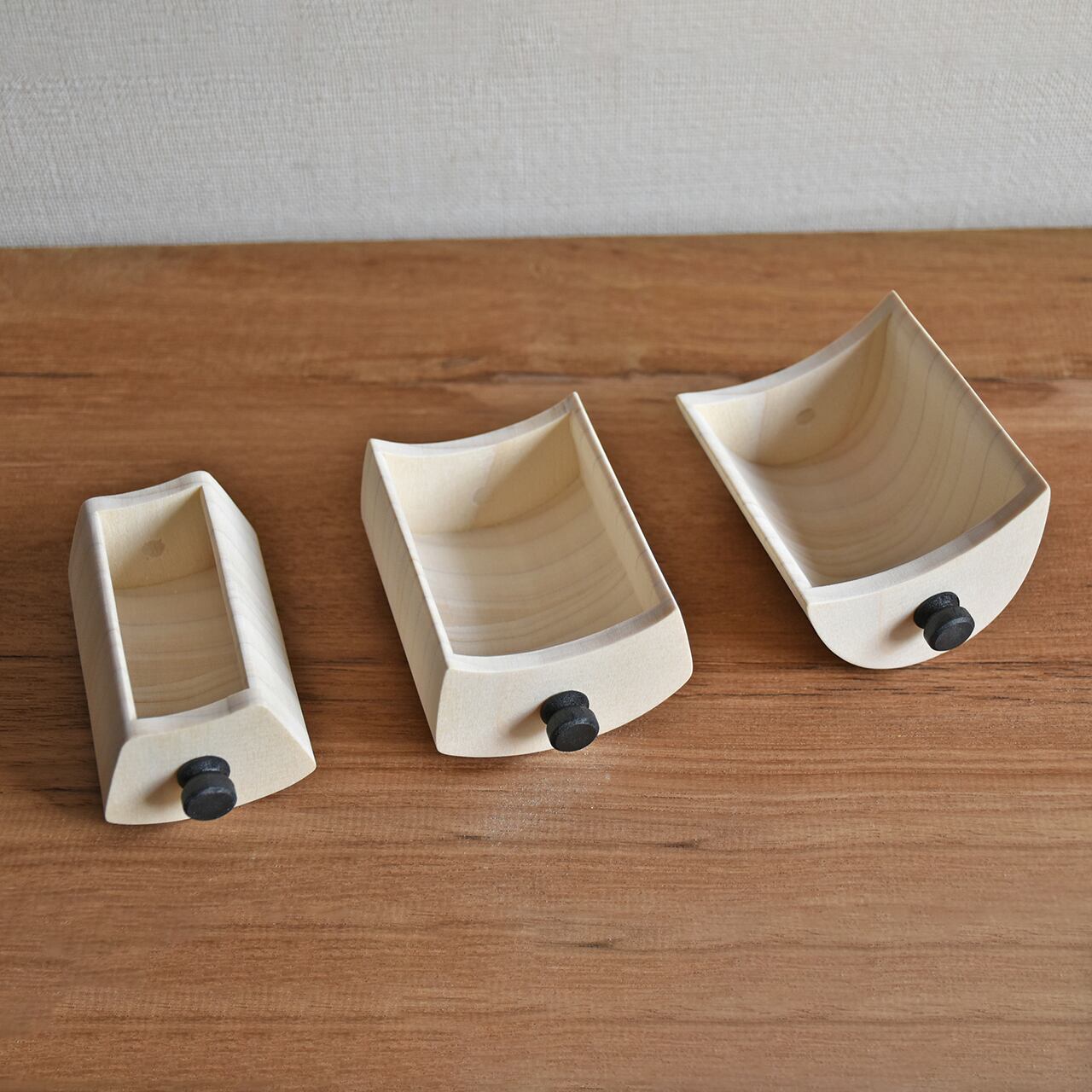木材は糸鋸盤で1つ1つカットし、引き出しの取手は旋盤機で製作。