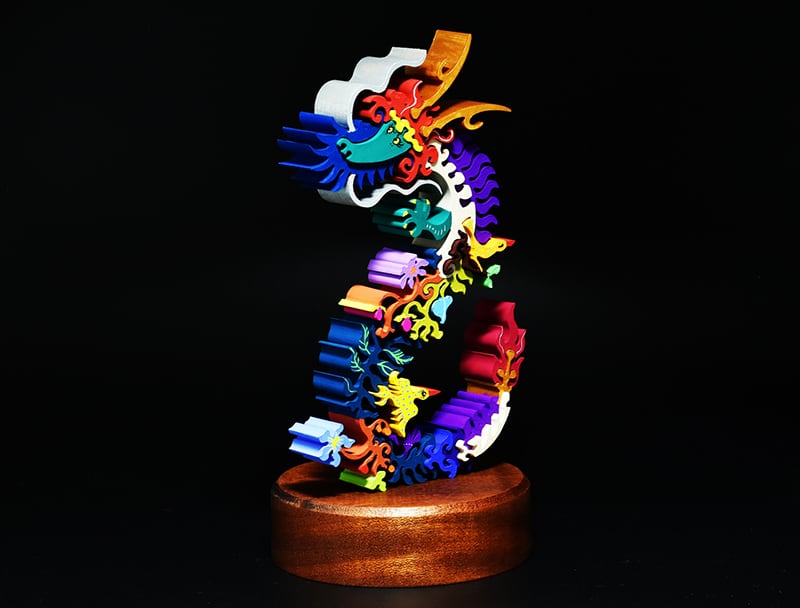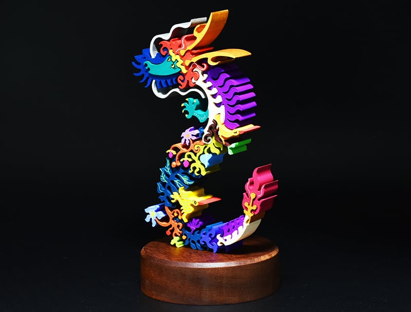 絡み合うツタや葉によって龍の身体が形づくられ、その中から龍の顔が浮かび上がる姿を表現しています。 繊細で可憐な植物と、力強く威厳のある龍とのコントラストがこの作品の大きな特徴です。 龍の周りを軽やかに飛び回る黄色い鳥が、全体にリズムとアクセントを加えています。 植物が複雑に絡み合うことで生まれた空間と、その中で不思議なバランスを保ちながら立つ龍のフォルムが、独特の存在感を放っています。